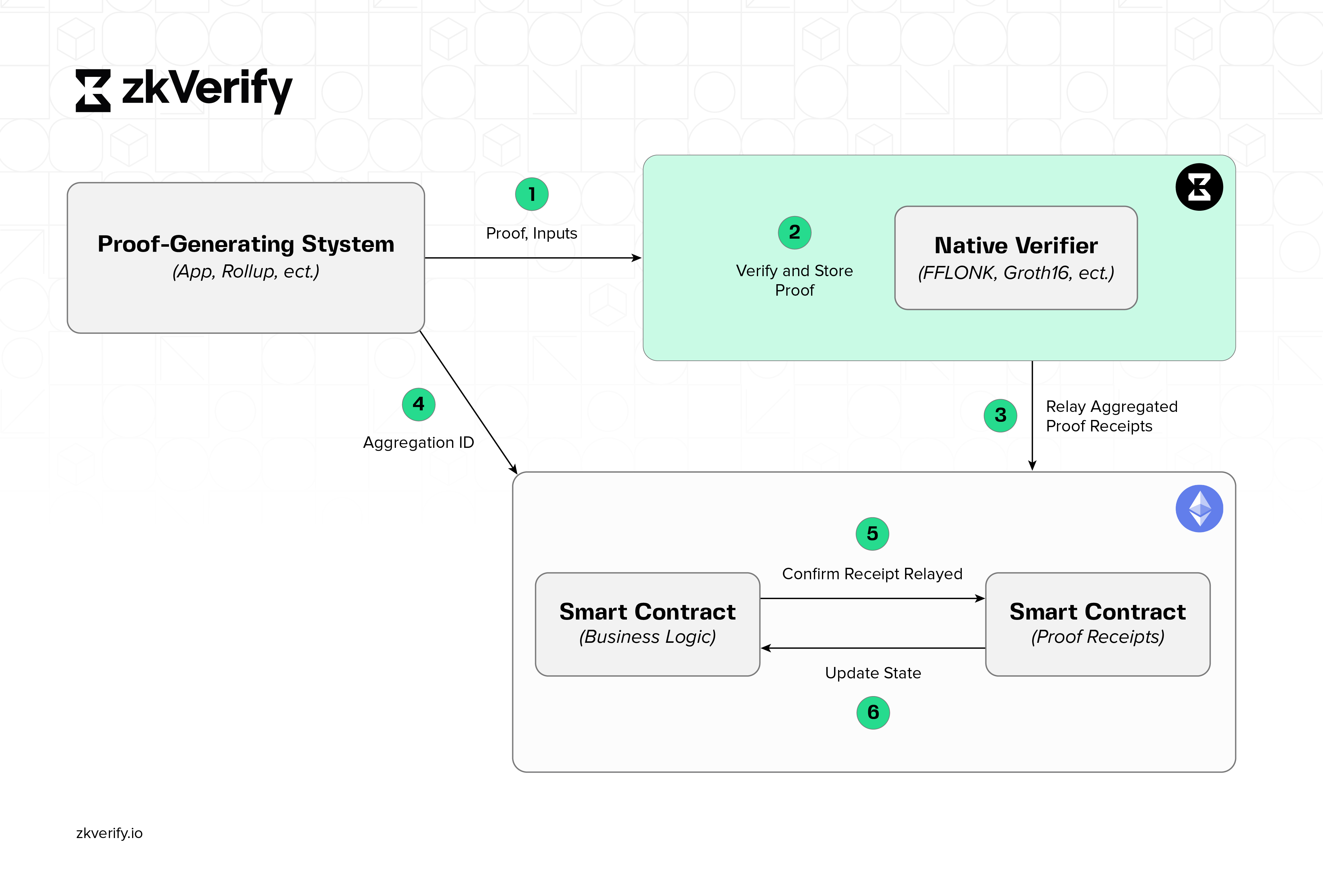 The figure below demonstrates one possible integration of zkVerify into a typical ZK application flow. The responsibility of verifying proofs has been delegated entirely to zkVerify, and only aggregations (small hashes) are ever stored on the settlement chain.